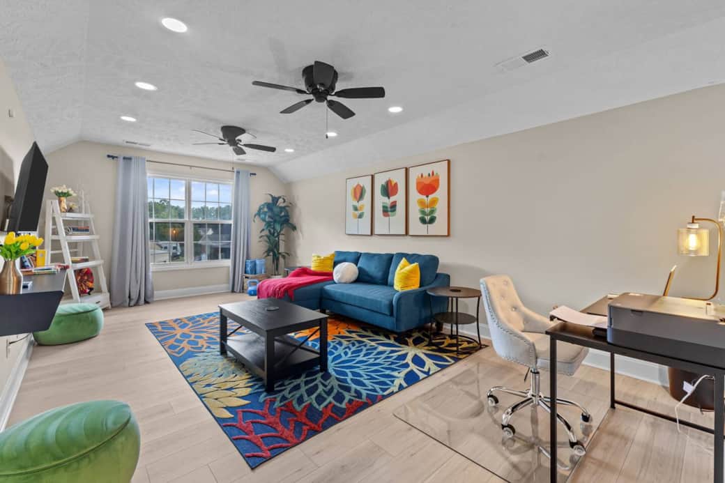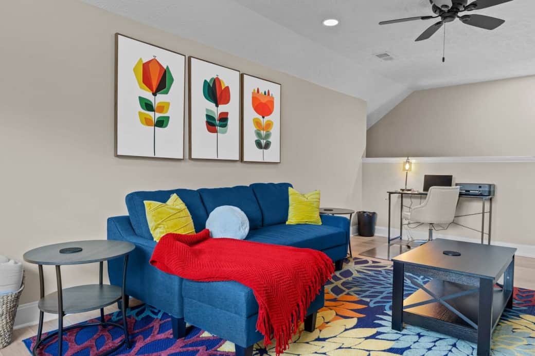 Living room comes with a smart TV where you may browse through live programming or you may sign in to your tv subscription accounts. Dimmable lighting and blackout curtains.